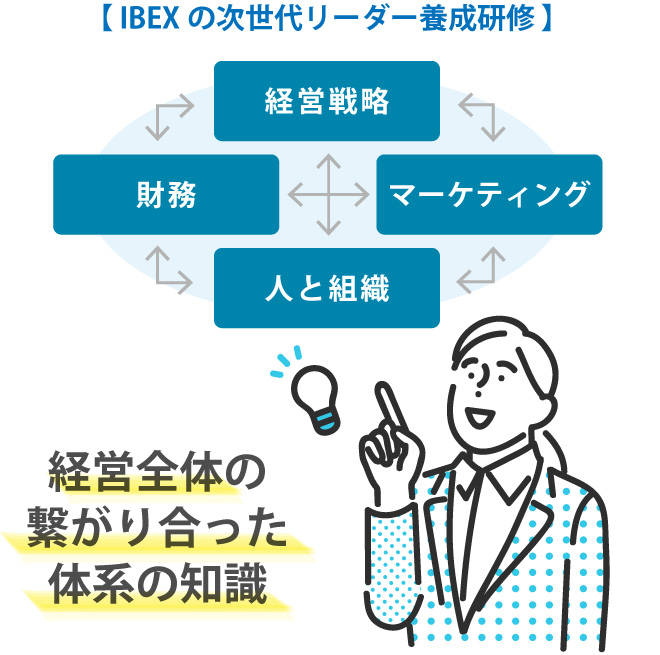 経営戦略、マーケティング、財務、人・組織マネジメントの知識を、それぞれ細切れではなく、一つの繋がり合った経営の体系としてとらえる事が大切です。