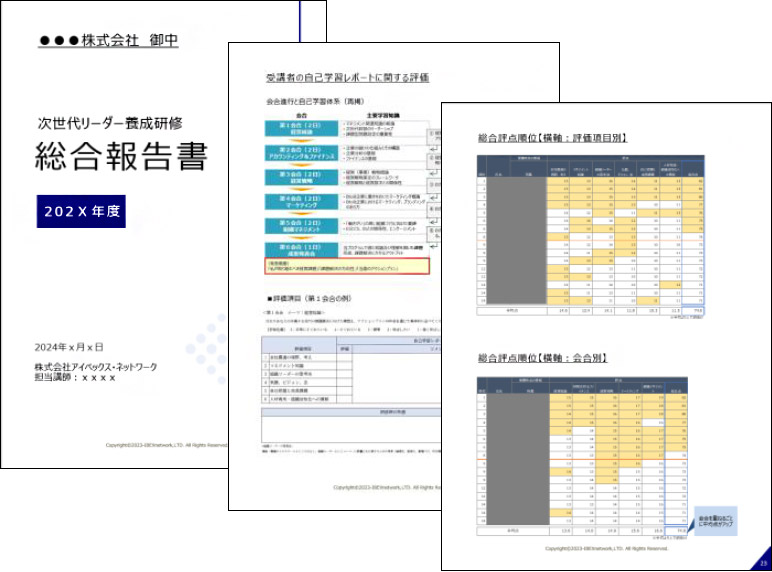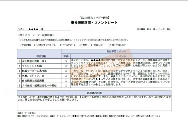 • 講師が受講者ひとり一人について、面談を実施し、次世代リーダーとしての適性や能力開発状況(その強みや伸びしろ)をアセスメントレポートにまとめて提出する場合もある(有料)。